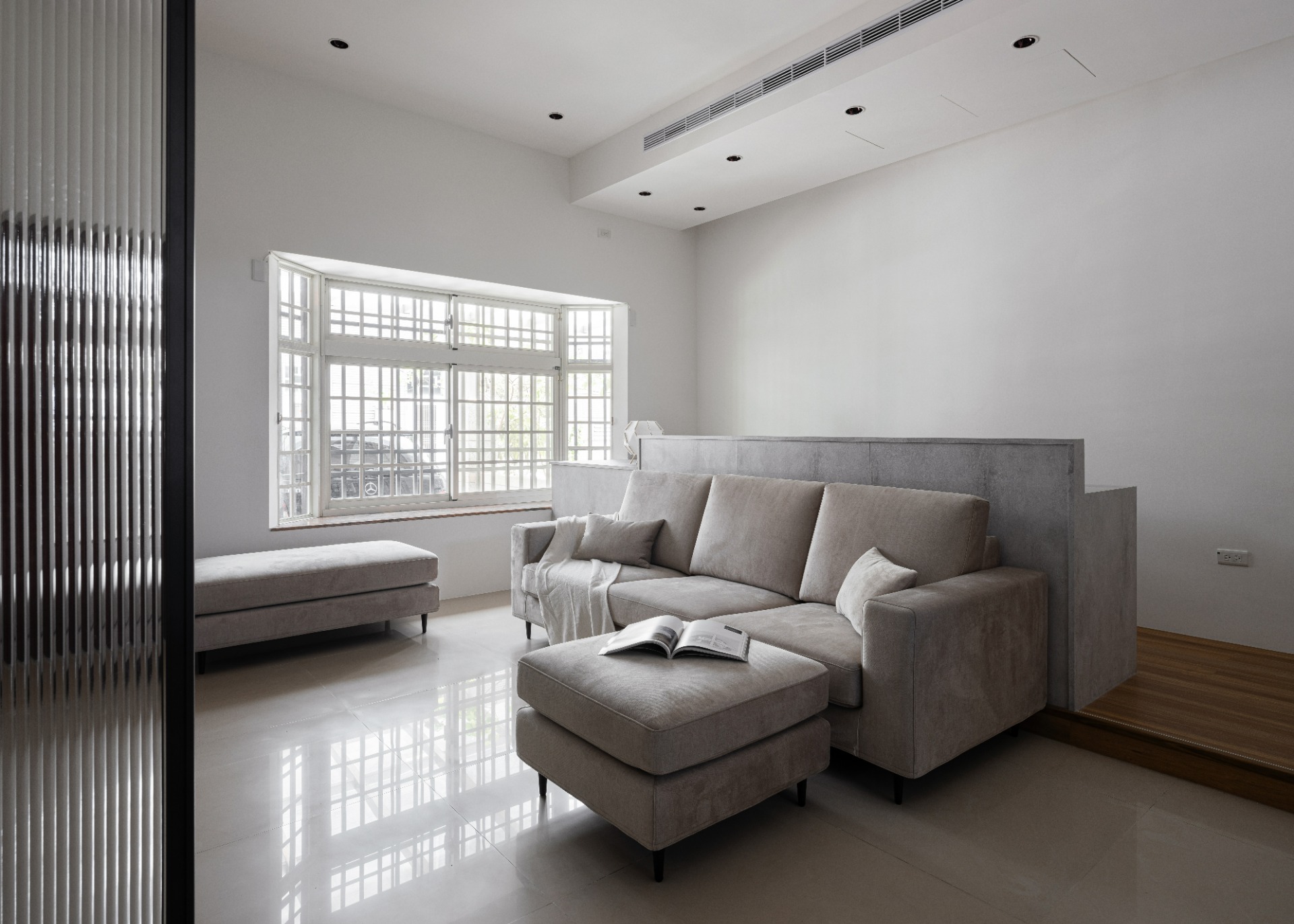 ▼ 因應屋主的需求,在客廳的後方設置工作區,以架高木底板分別區域, 打造一個能夠感受到生活愜意的工作空間 。