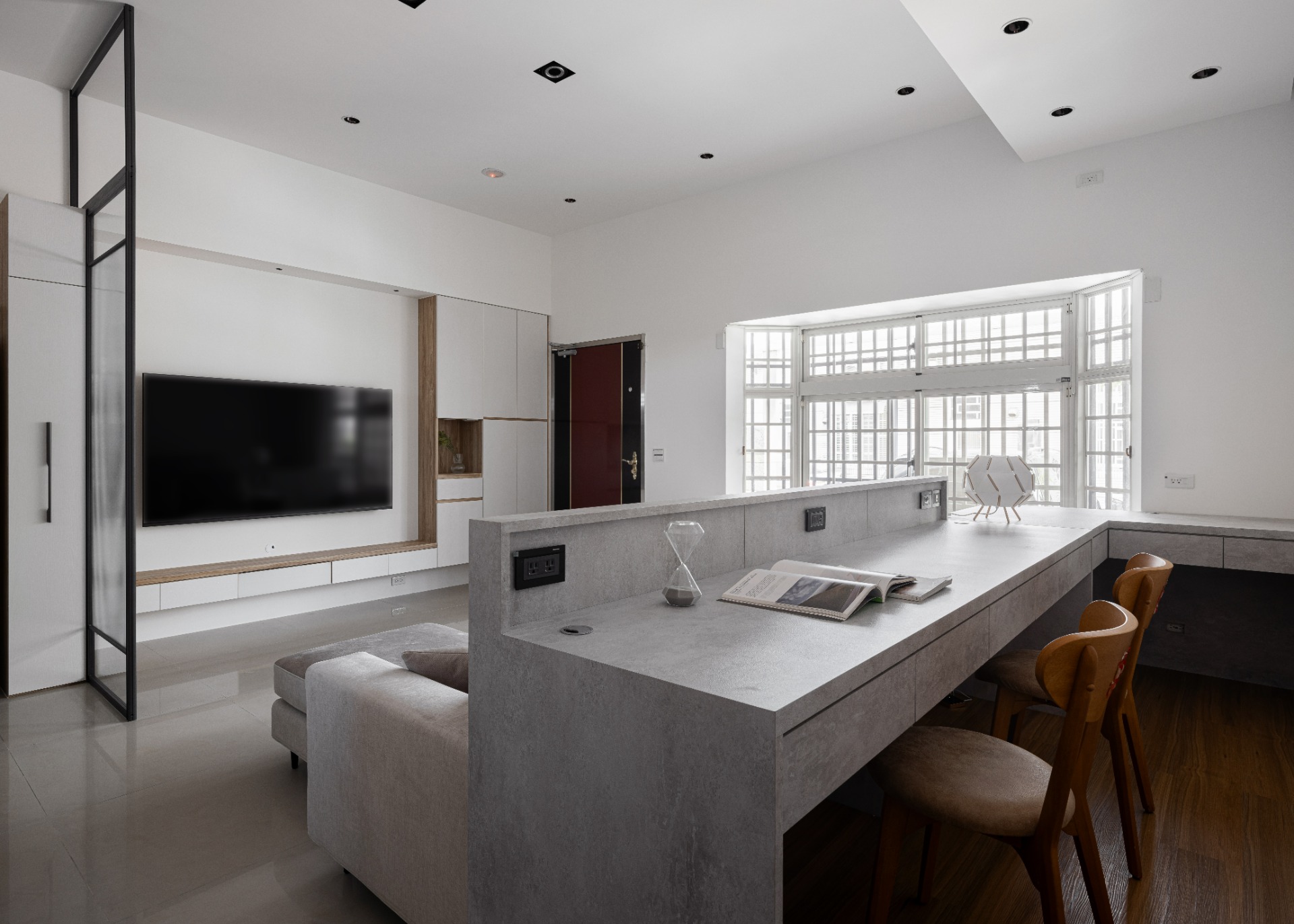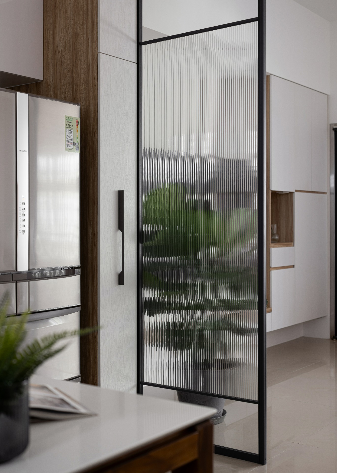 ▼ 以開放式格局規劃,在大門與廚房之間設置鐵件長虹玻璃門區隔空間,沒有入門見廚房,俗稱開門見灶的風水禁忌。