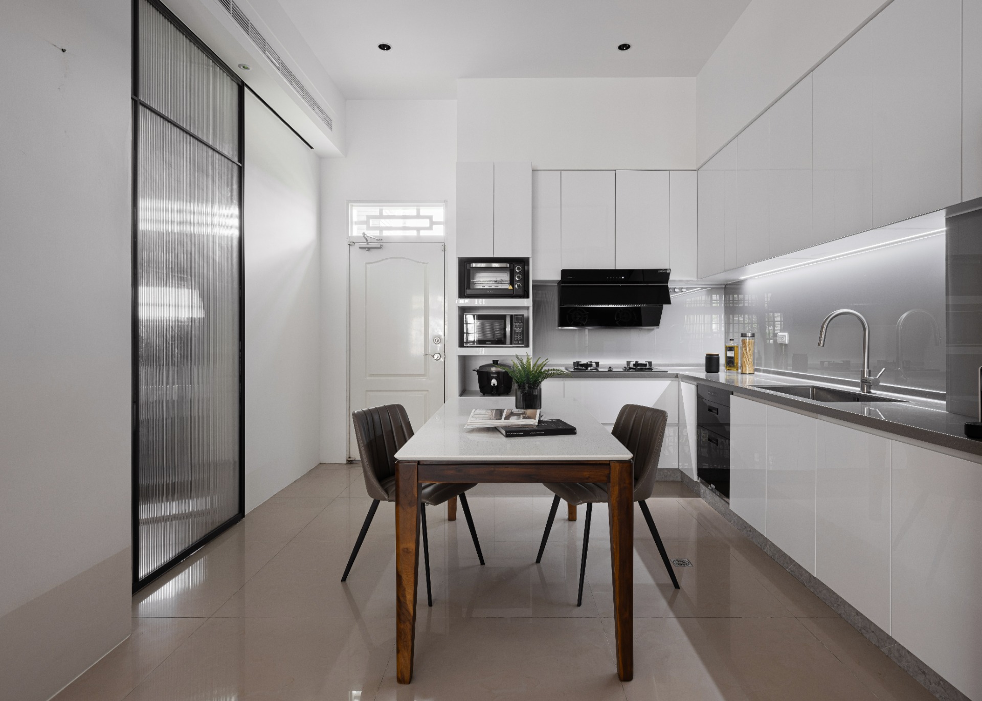 ▼ L型ˇ的規劃提供充裕的廚房空間,以白色櫃體為主軸,搭配黑色、金屬質感家電,給人俐落、乾淨的感覺。