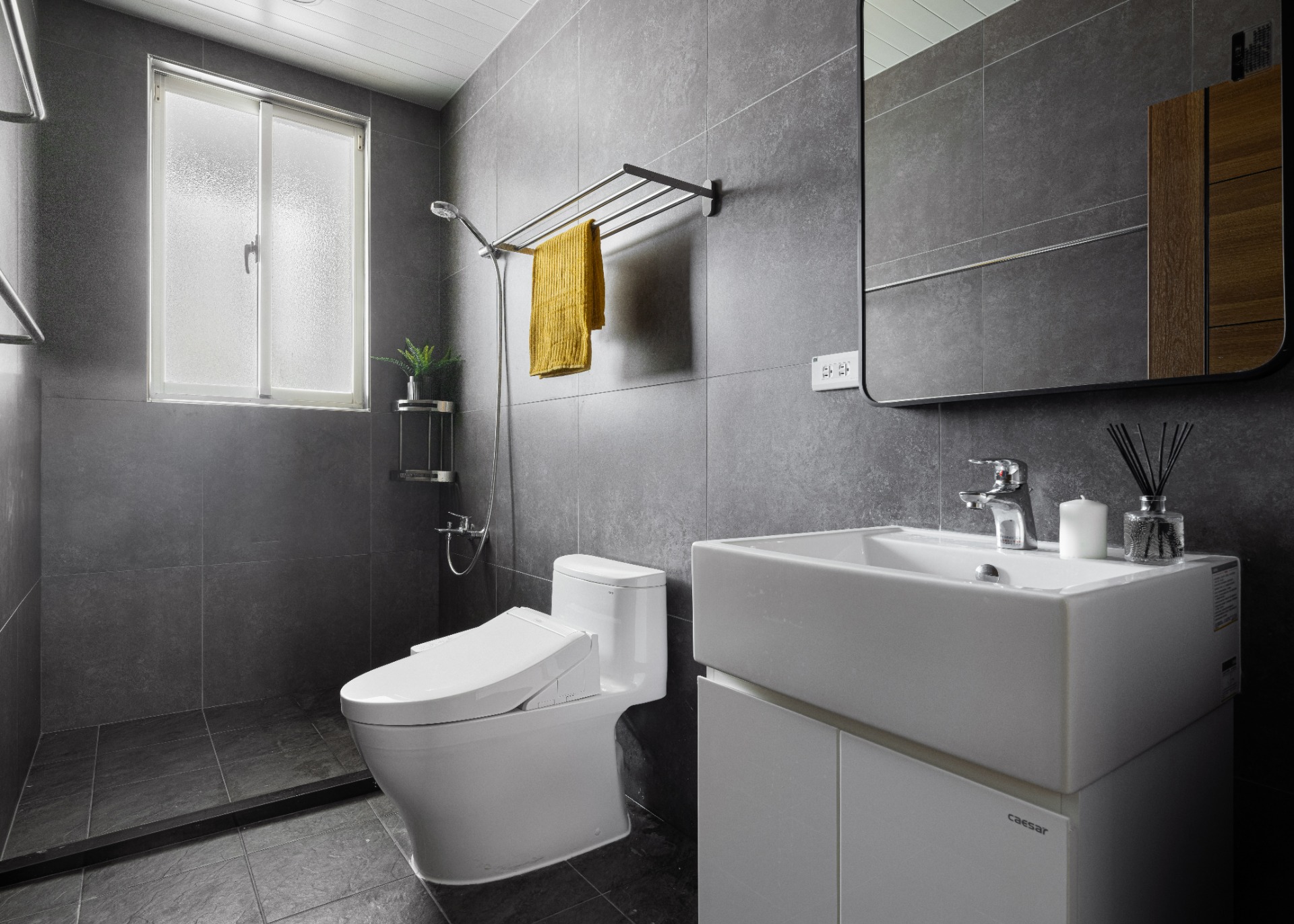 ▼ 以灰色系為主軸,廁所牆面採用較大面積的磁磚,減少縫隙美觀又好清潔。
