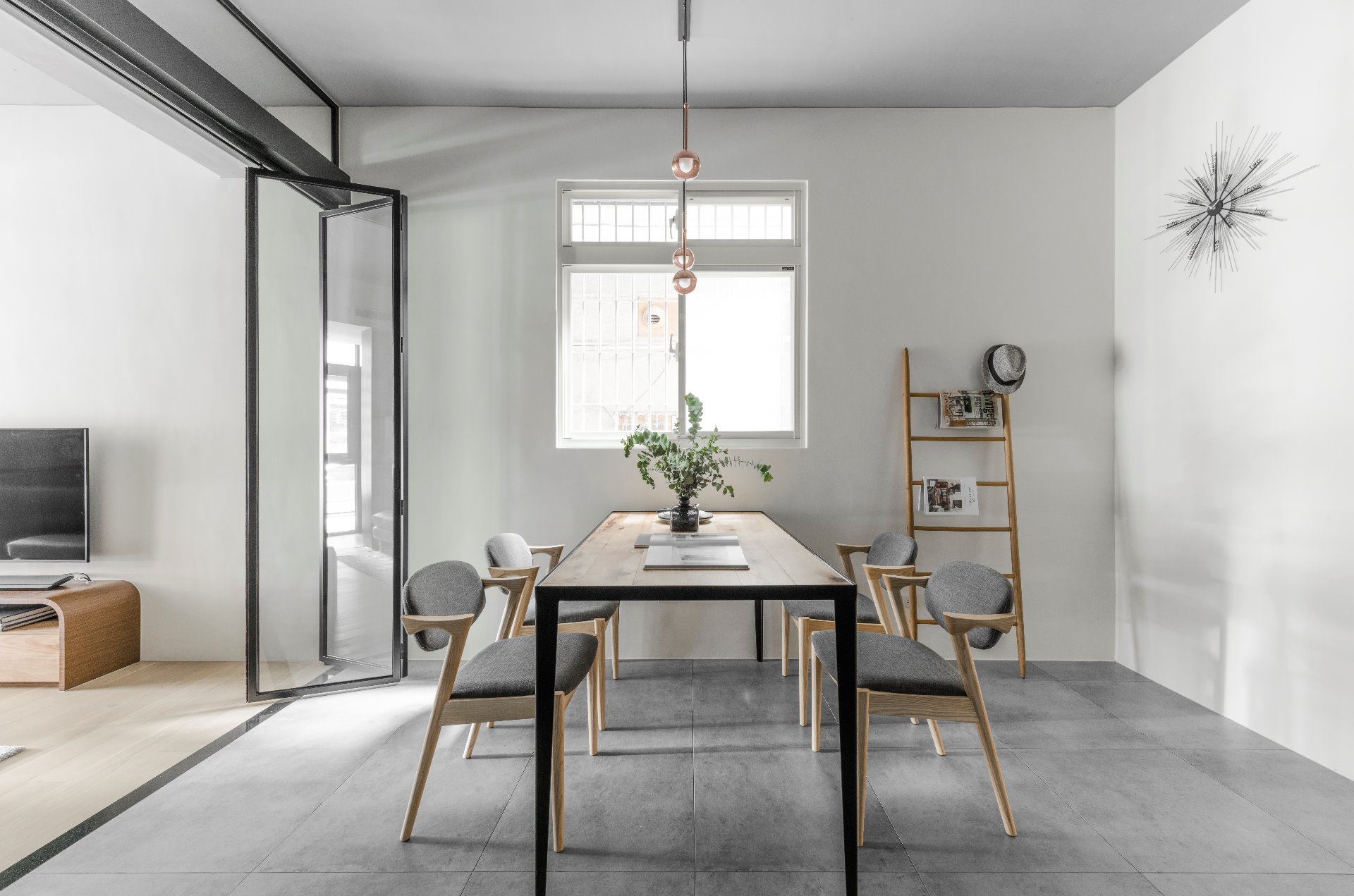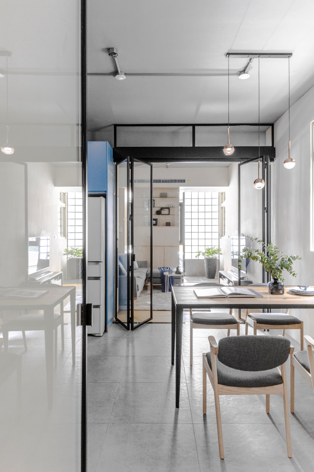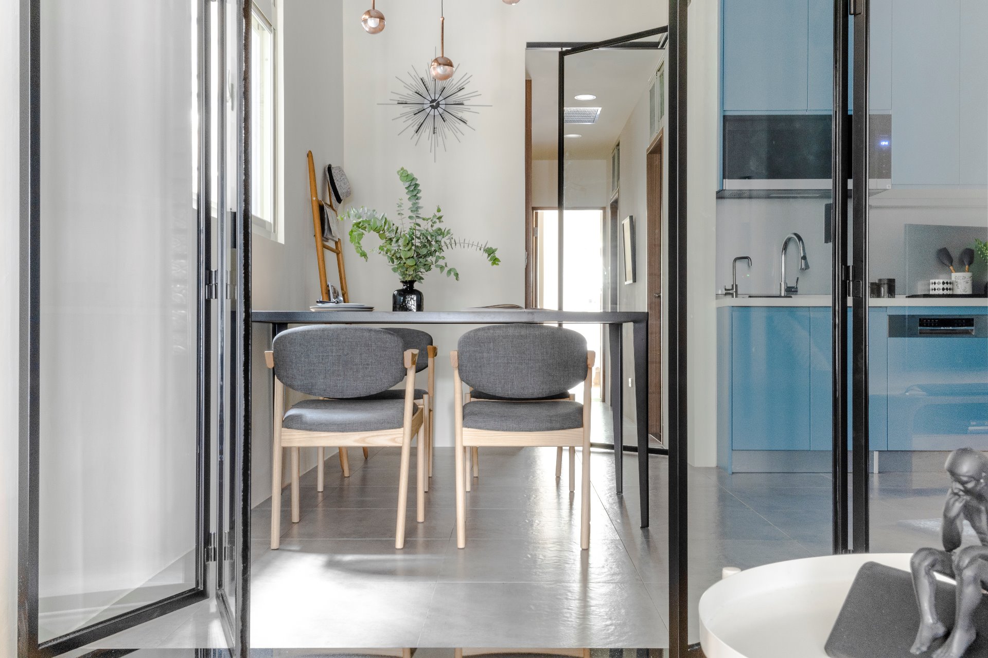 客廳與餐廳之間的全開玻璃折疊拉門,方便在廚房使用時拉起隔離油煙,不特別劃分區域又保有彈性的機能作用 ▲