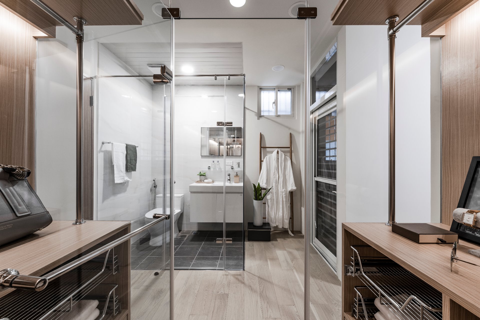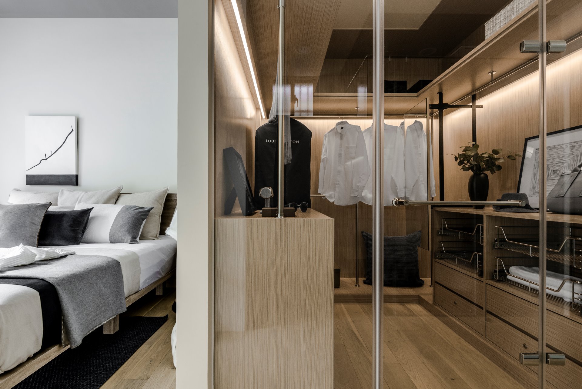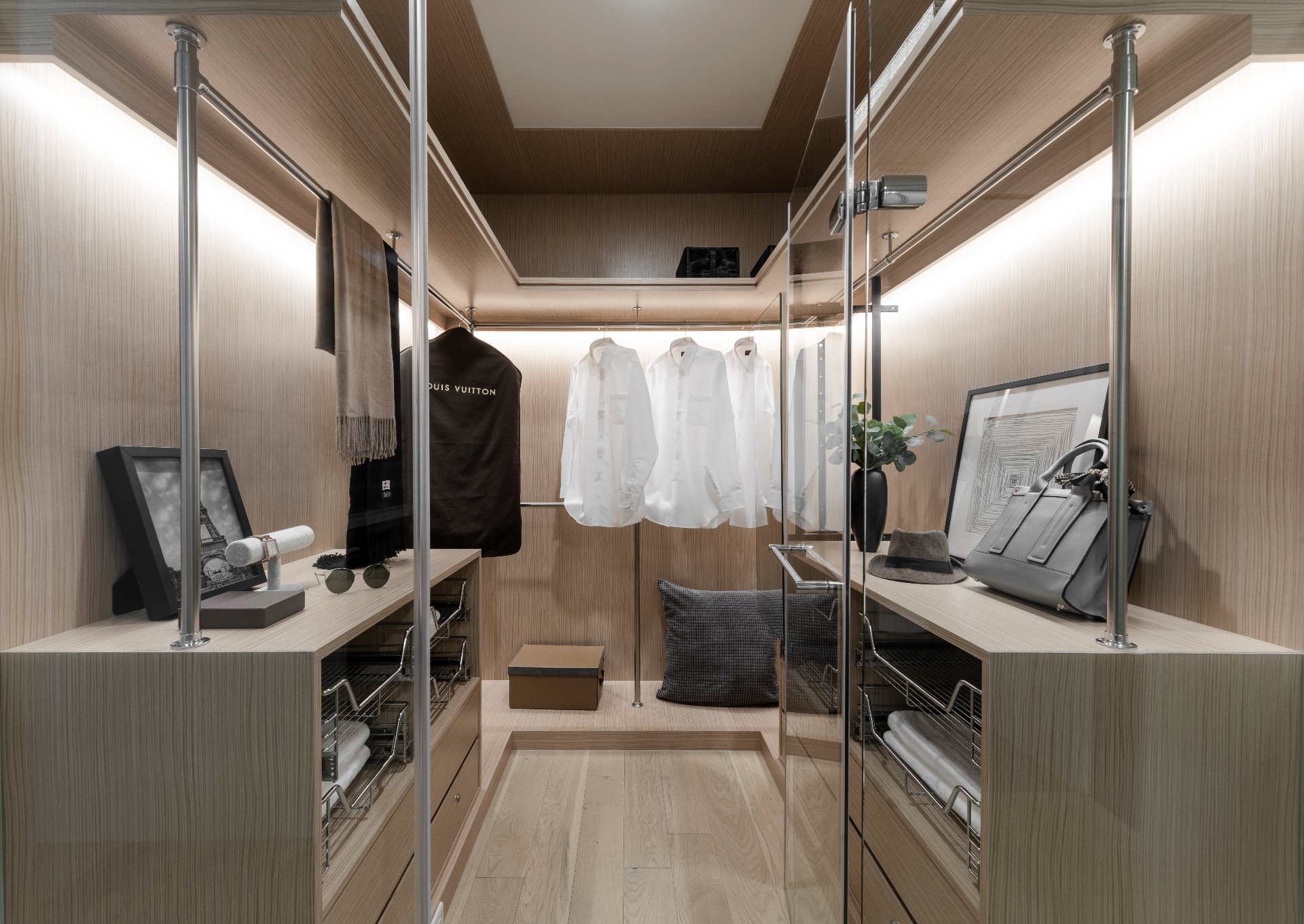 獨立的更衣空間,同時兼有吊桿、抽屜及上方置物區域,方便滿足各式物品的收納及使用 ▲