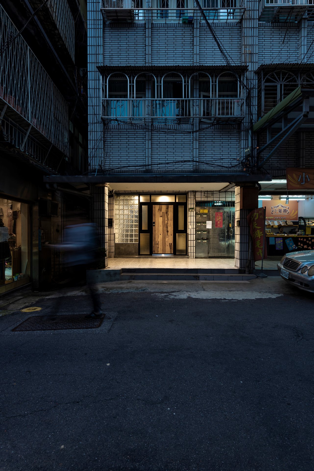 大門入口外觀,原為增加室內採光而建構的玻璃磚牆,亦反射出屋內的光源,在黑暗中特別引領著視線的停留,打造出療癒溫暖的氛圍 ▲