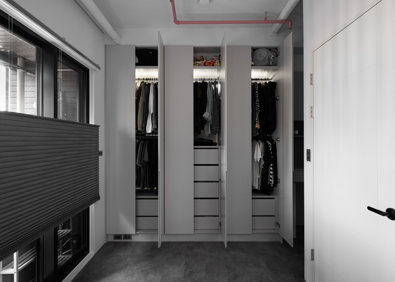 ▼衣櫃配置的衣架和抽屜數量,皆根據屋主的需求進行選擇,提供整齊、有序的儲存空間。