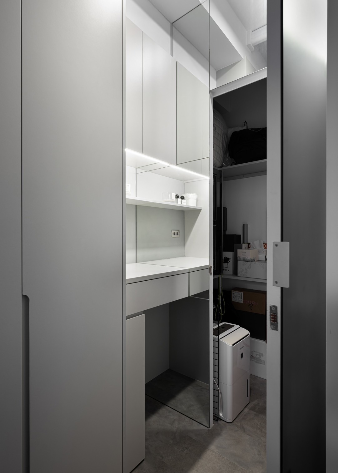 ▲衣櫃旁邊的角落空間,規劃成開放式化妝台,並連接可步入的儲藏室,滿足生活用品的收納。