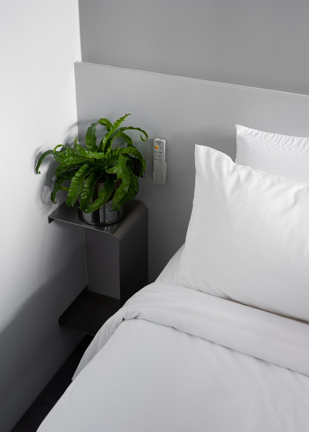▼一體成形的不鏽鋼床頭櫃,搭配曲的弧度,讓金屬感材質不會過於剛硬。