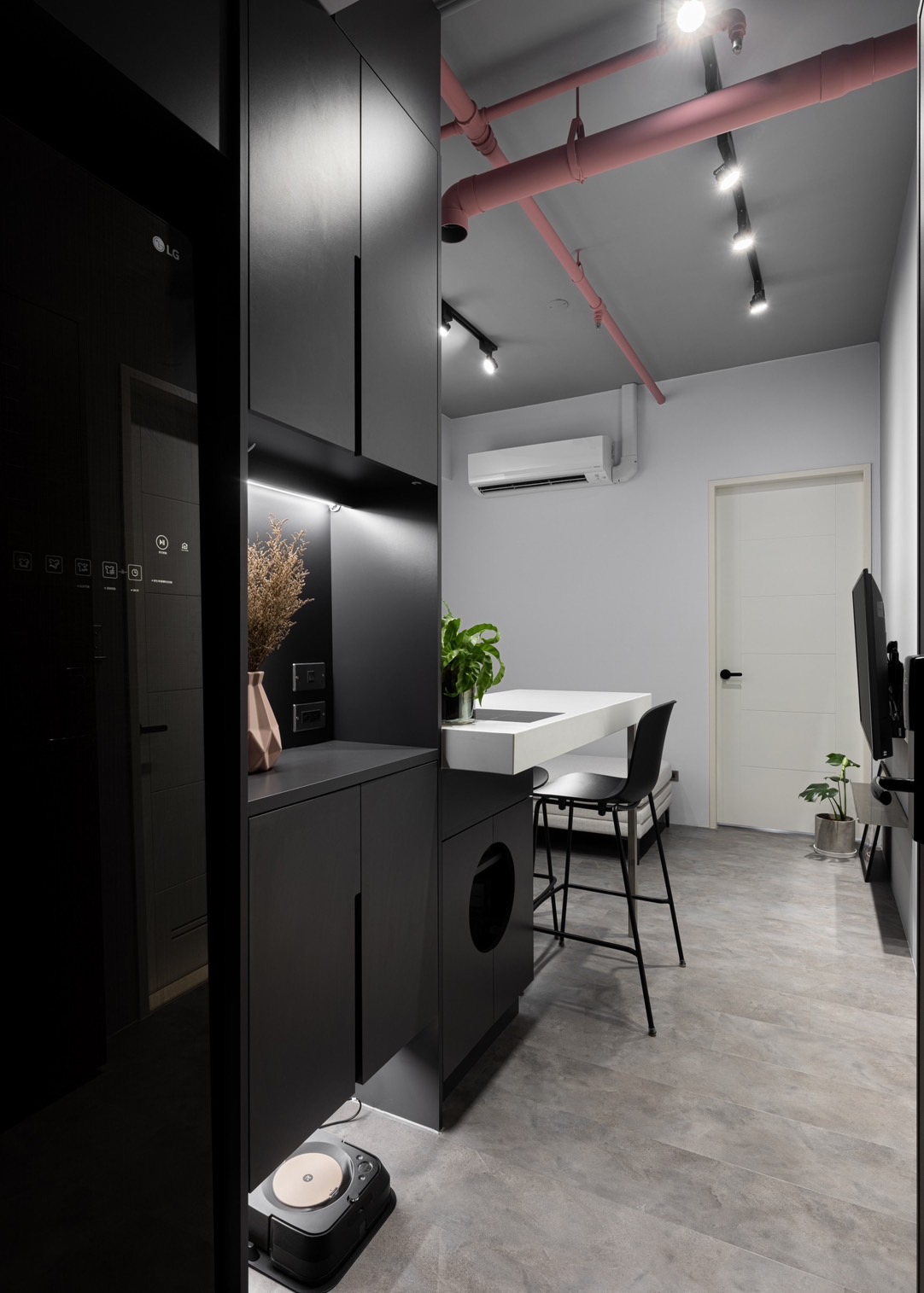 ▼在灰色系中,用煙燻粉紅適當地添加色彩,讓本該隱藏的管線變身成有趣的視覺焦點。