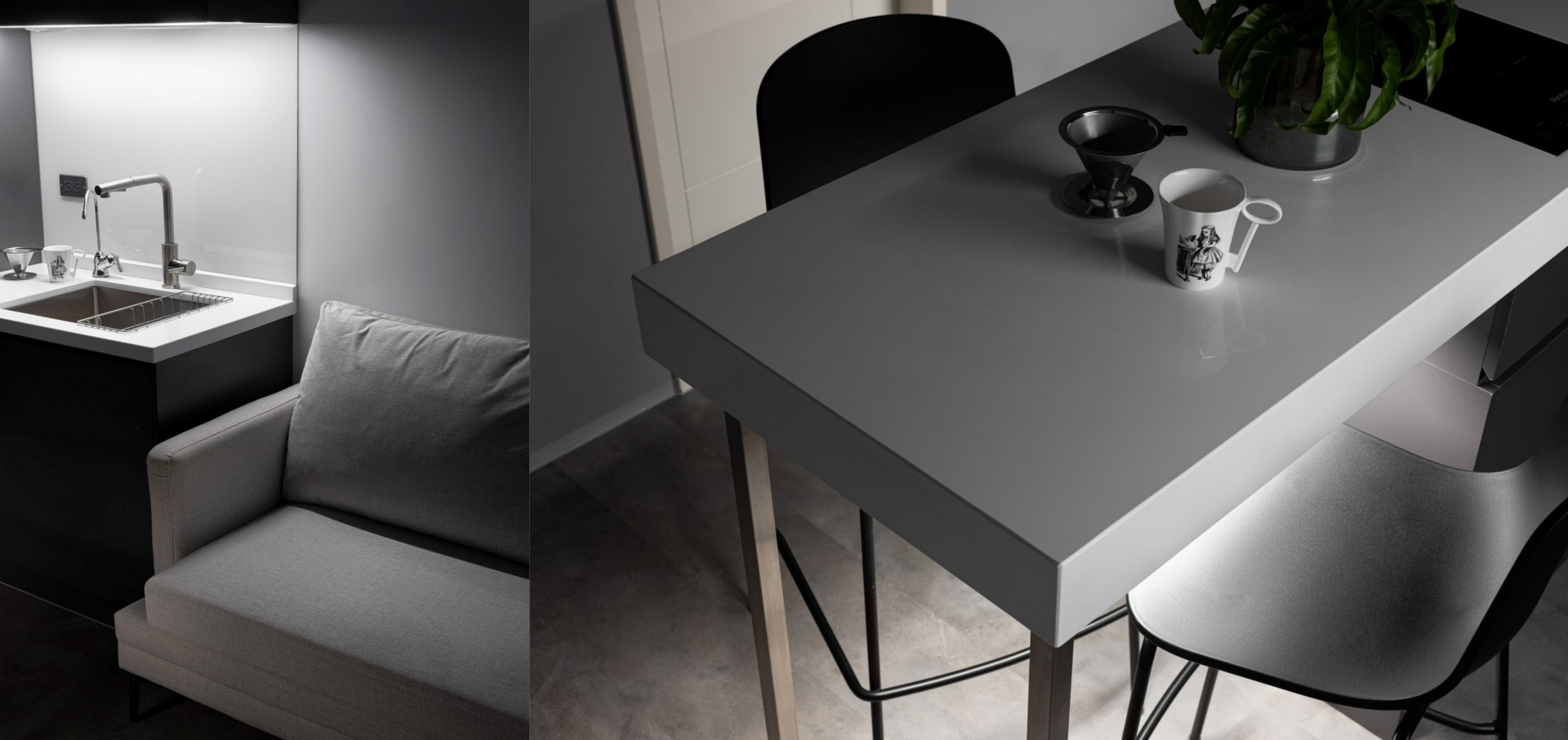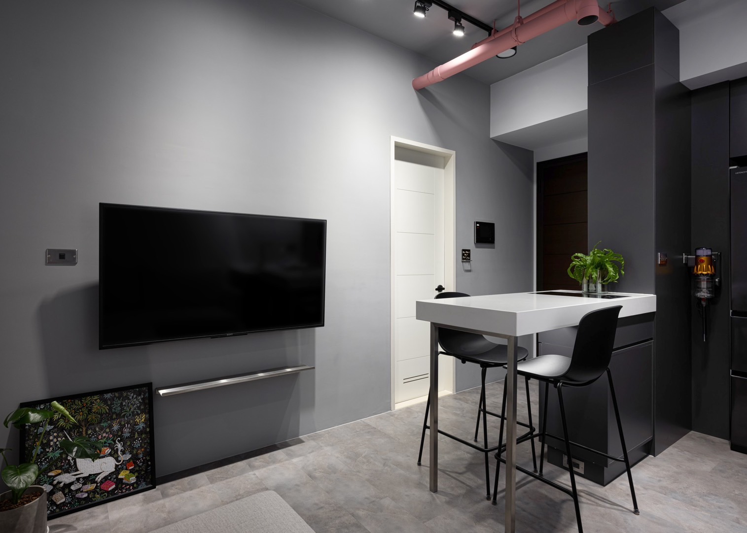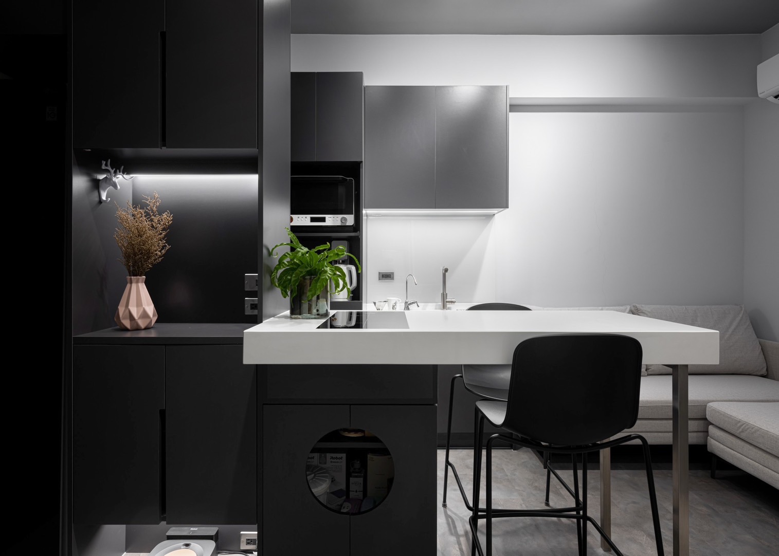 ▼客廳則以深灰色的櫃體為主,銜接吧檯使線條整齊劃一,崁入式電磁爐可以烹飪也保有用餐空間,平坦的桌面在需要時也能作為工作區域使用。