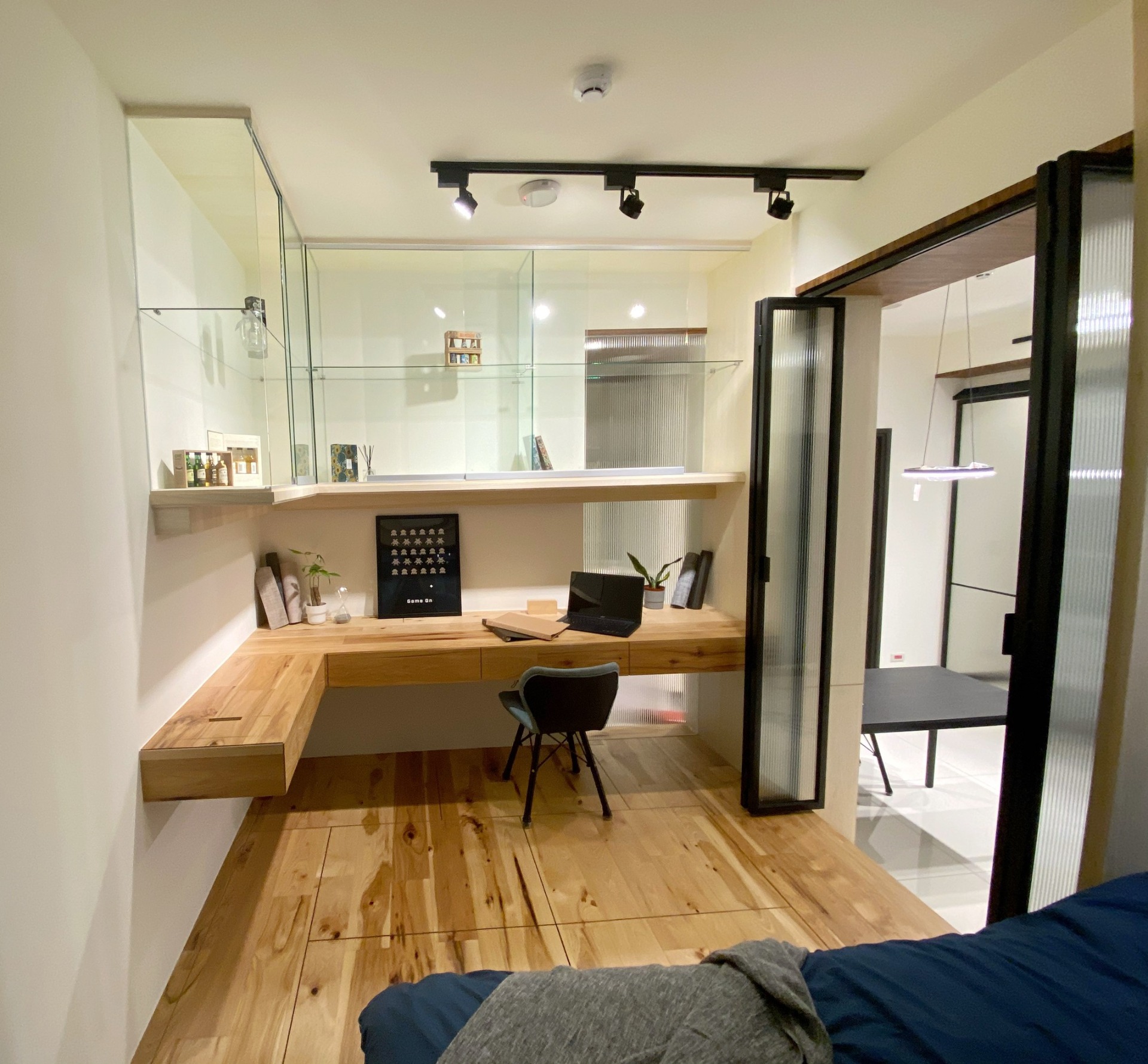 書房兼作臥室,L型的書桌提供舒適寬闊的使用環境。玻璃層櫃可放置豐富收藏品,成為可收納的展示空間▲