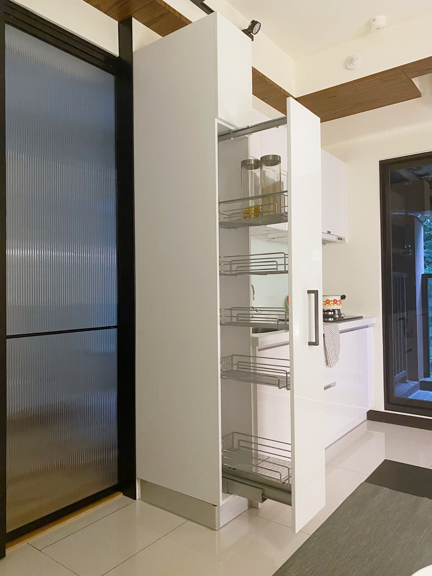 廚房以白色打造清爽的印象,具有緩衝配件的側拉櫃體,在使用上相當輕鬆順暢▲