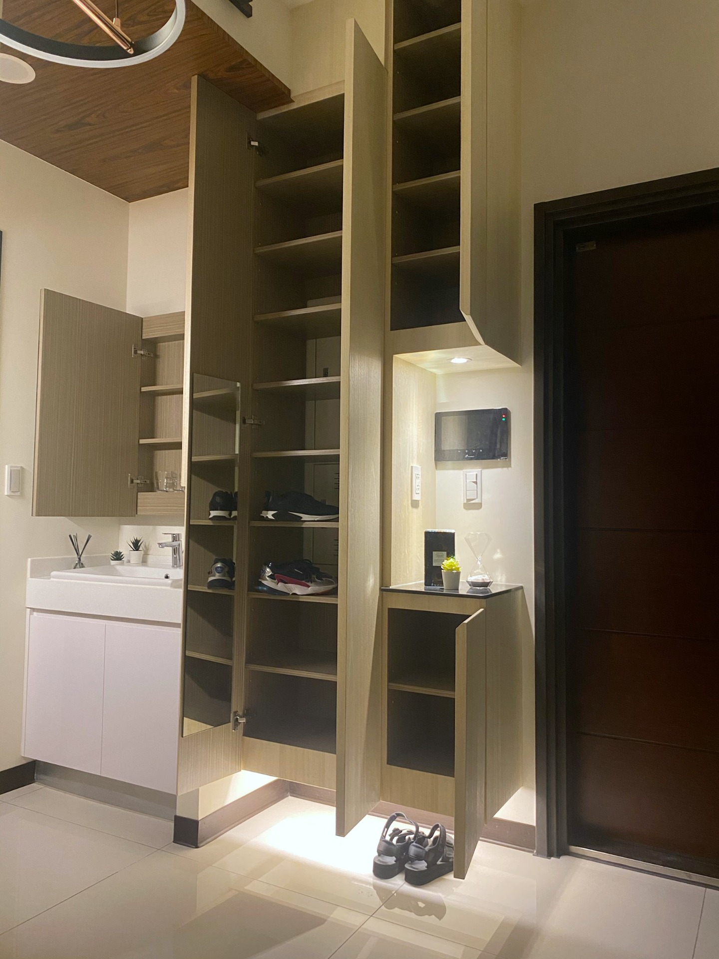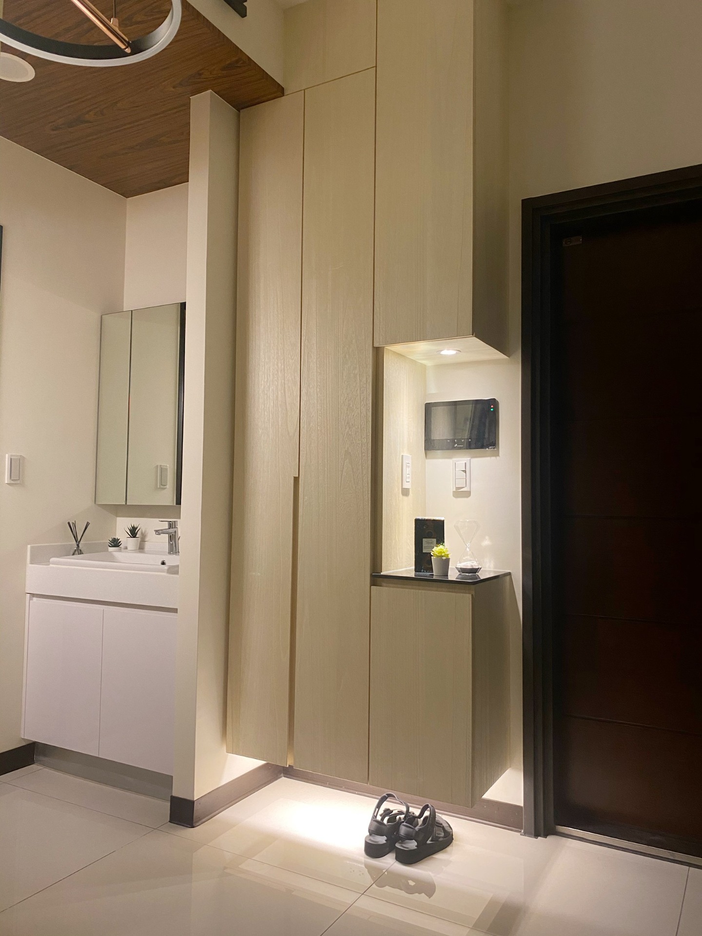 玄關由梧桐風化木的鞋櫃為主體,淺色的木紋緩解櫃體延伸至天花板的侷促感,連接於一旁的洗手台亦提供了出入門時良好而實用的動線▲