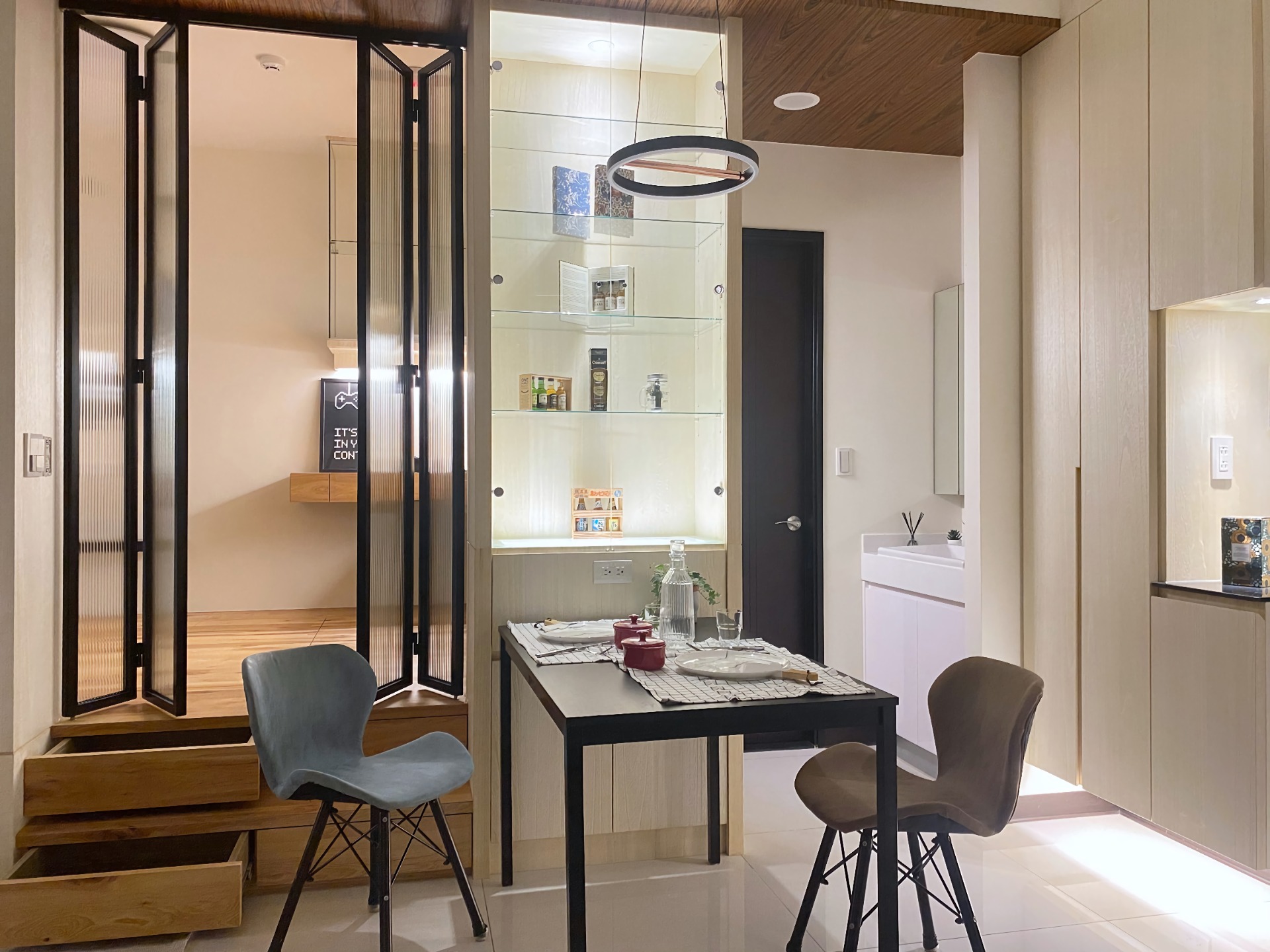 在11.5坪的小空間裡,打造出一室多用的可能性,保留彈性的使用空間。大片的展示收納櫃,則營造出了自身品味的生活美學。